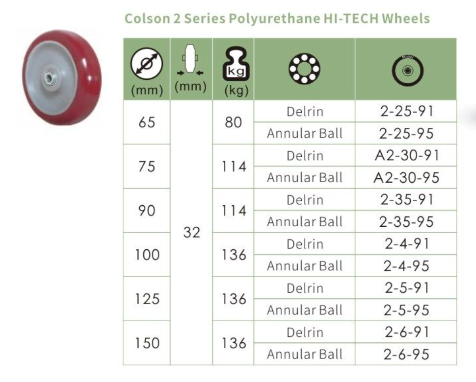 Colson Hi-tech Polyurethane Wheel industrial strength polyurethane tread is bonded to a "ribbed" polyolefin core. This design adds strength for loads subjected to shock and hard impacts. Tread is molded in around and through a ribbed extension of the core to prevent debonding. This wheel offers advantage of light weight and protects environment.