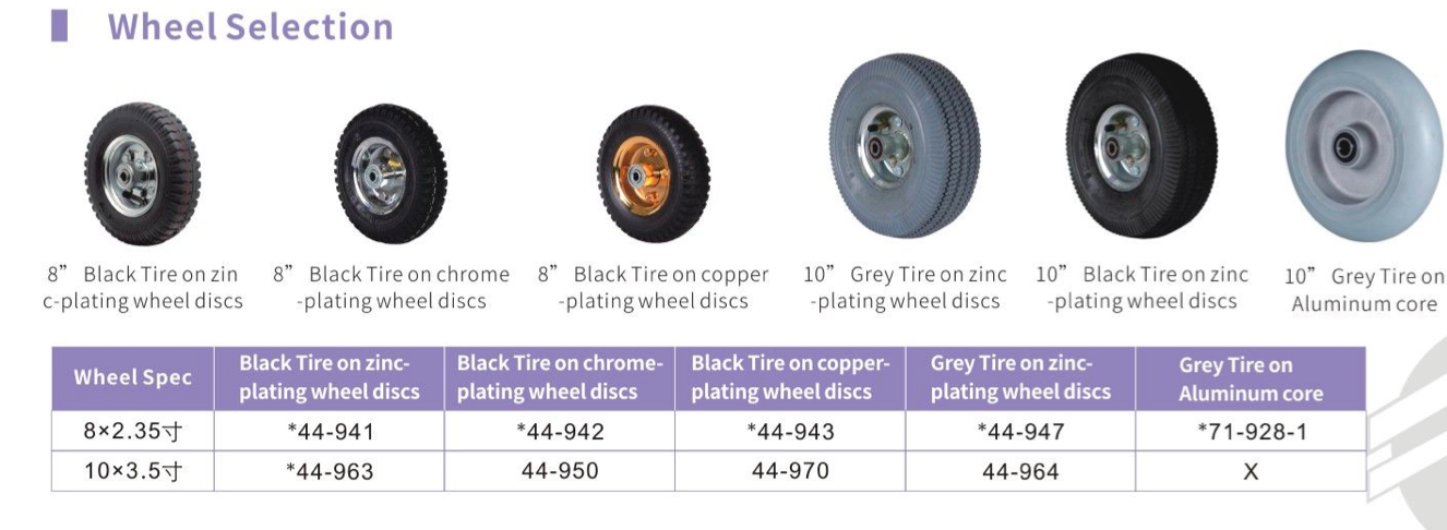 Extra wide fork accommodate large pneumatic wheel.