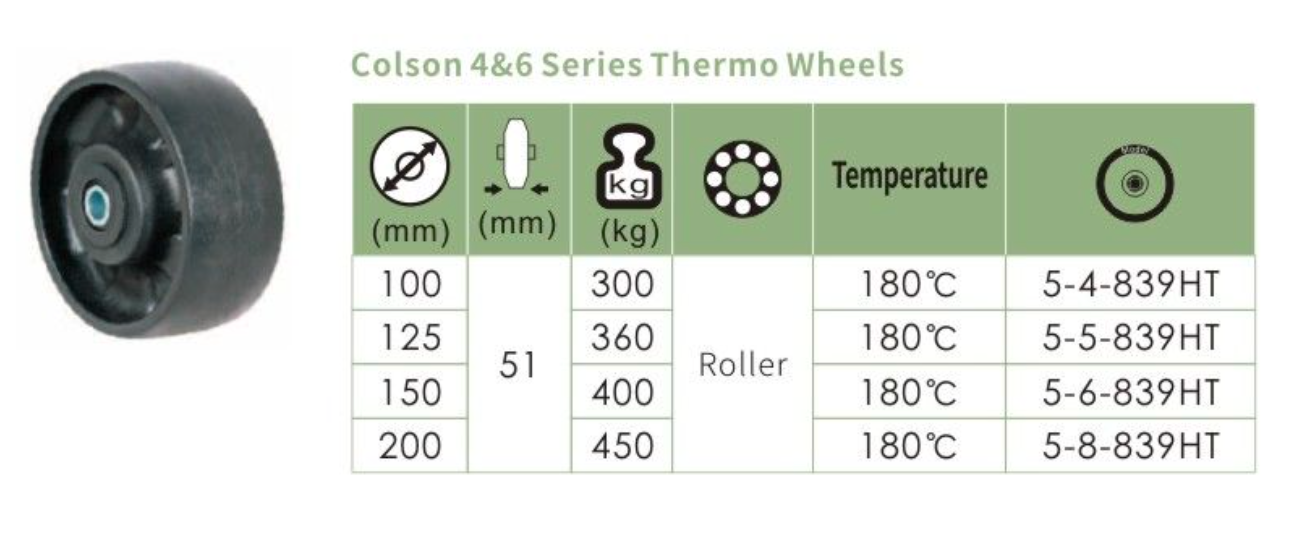 These wheels are molded from an exclusive engineered resin compound that offers non-marking floor protection, near zero water absorption, high load capacities and long service life. Thermo wheels feature a standard operating temperature range from -56℃ to +230℃. Highly resistant to animal fats, vegetable oils and salt solutions, thermo wheels are ideal for applications in food-processing and Traditional Chinese medicine processing.