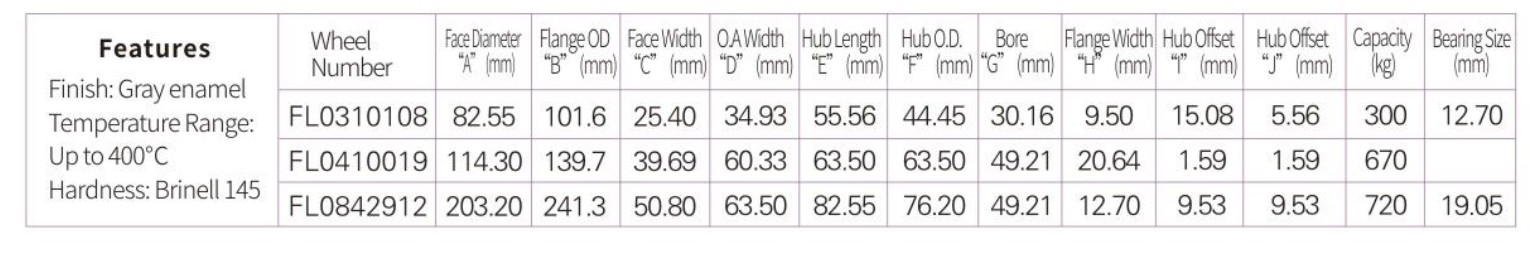 Various bore sizes available for use as plain bore wheels or to be used with keyway and set screw or with a variety of bearings.